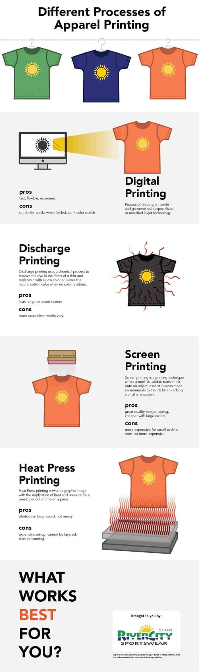 In the above infographic, we take a look at the pros and cons of four different types of apparel printing: