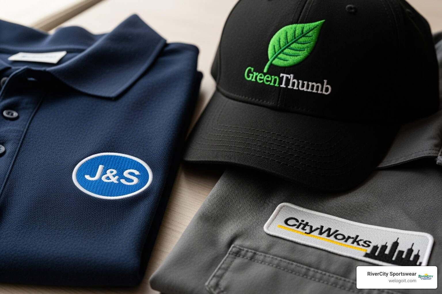 • What they are: Work shirts, polos, jackets with custom logos stitched in thread